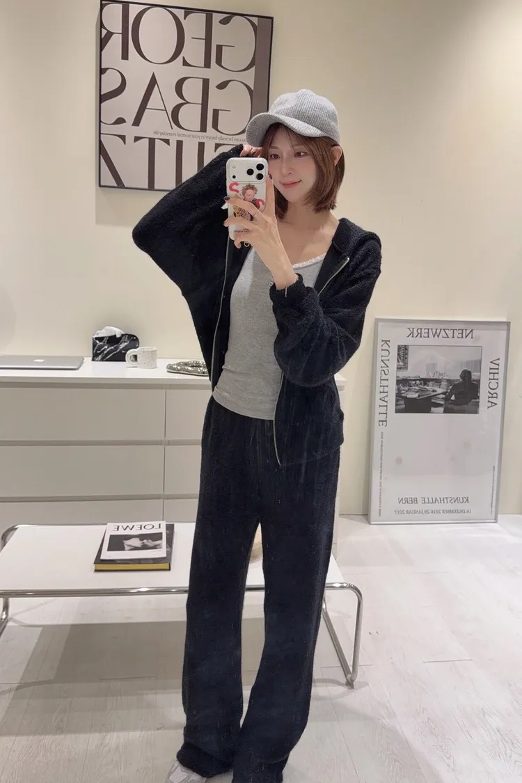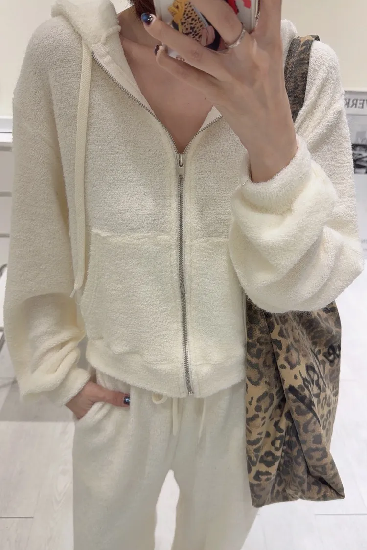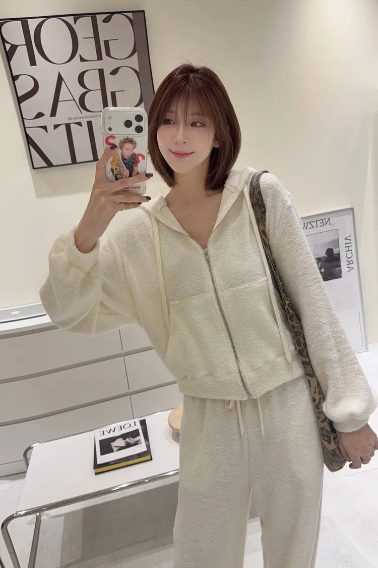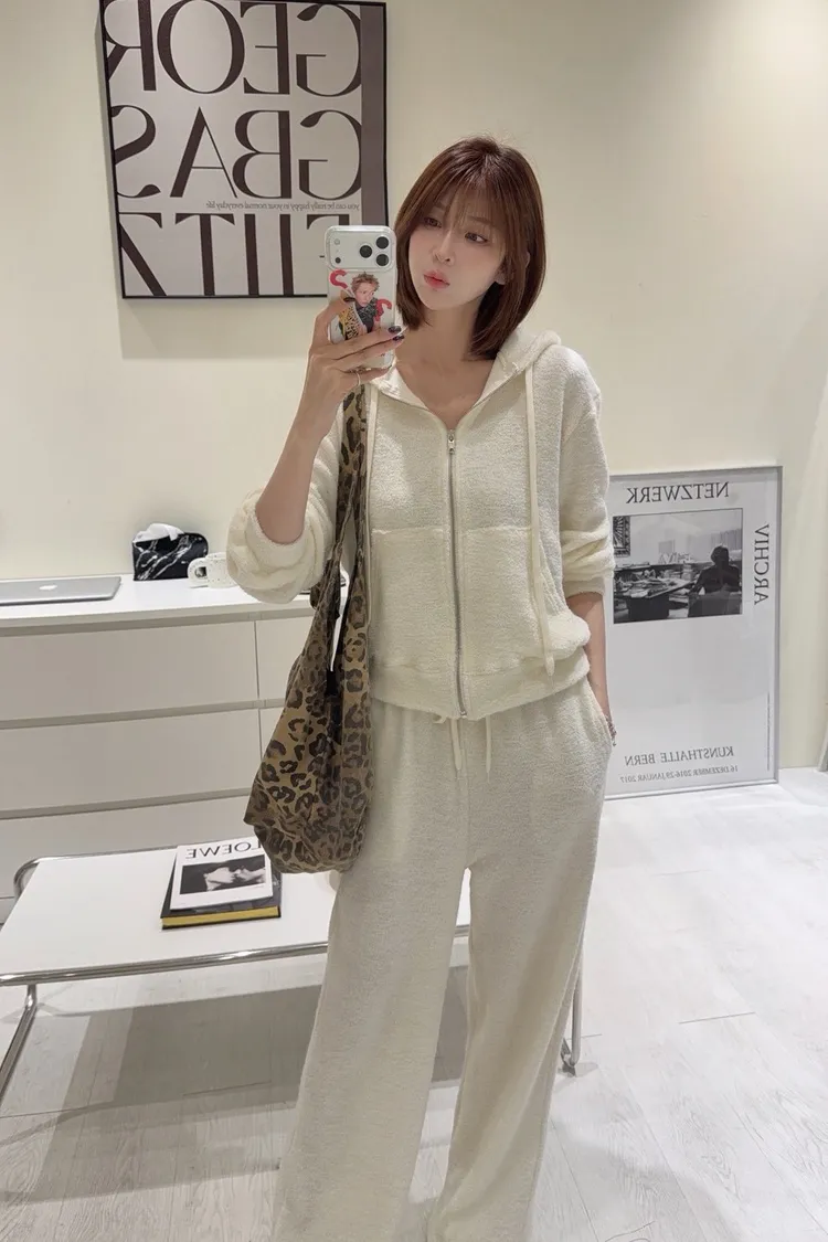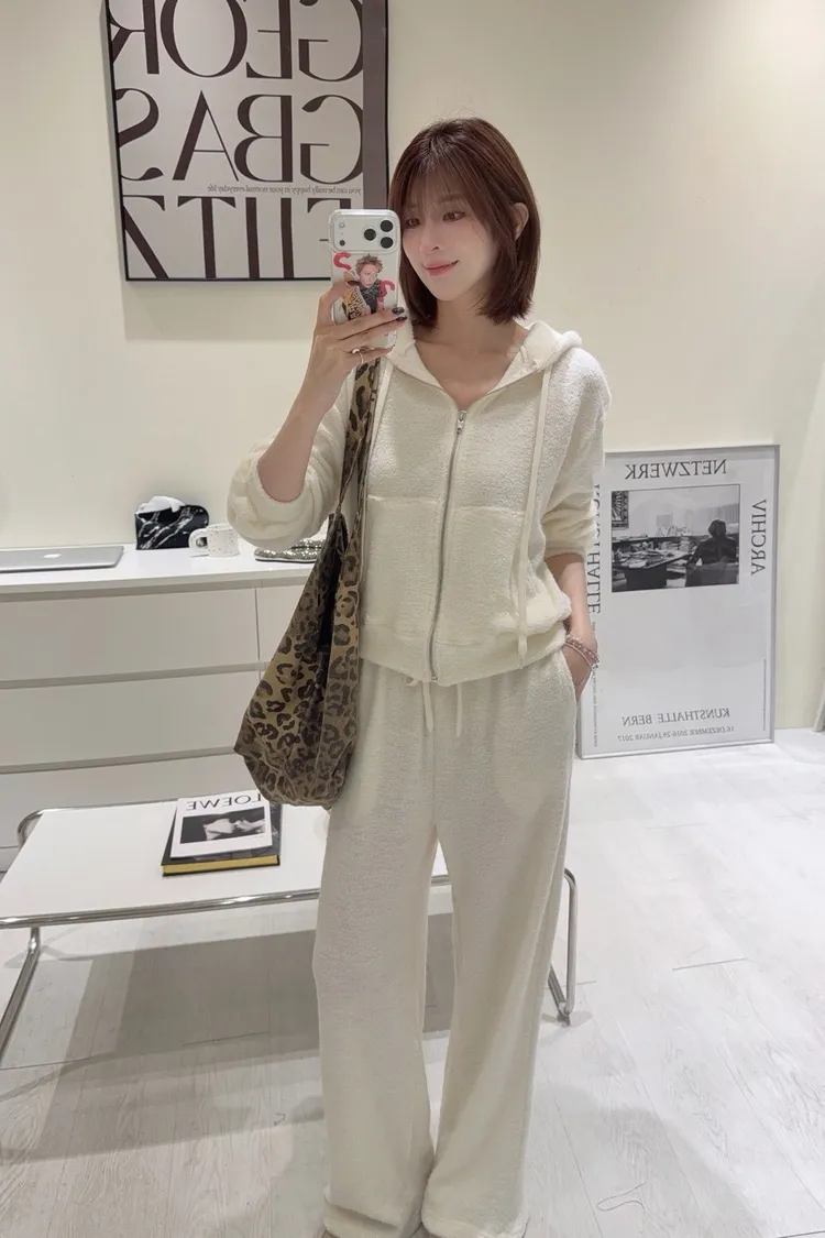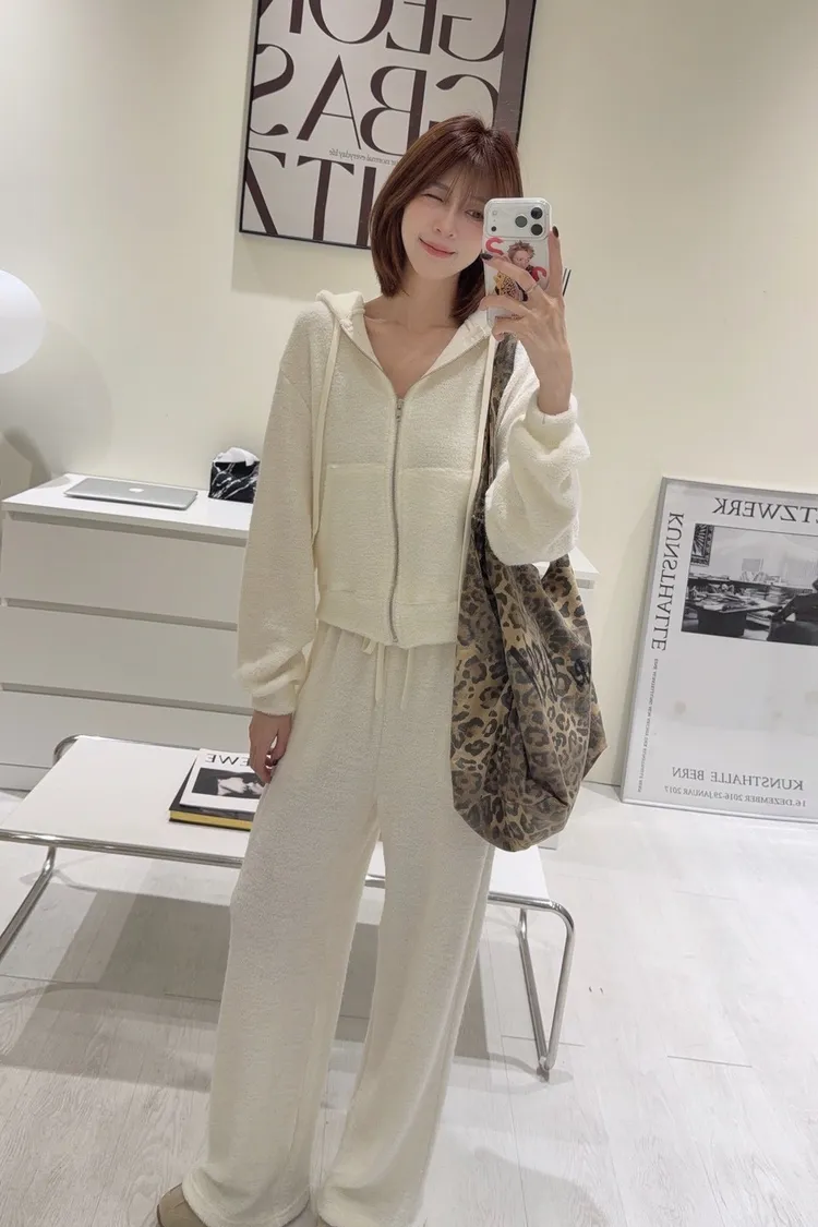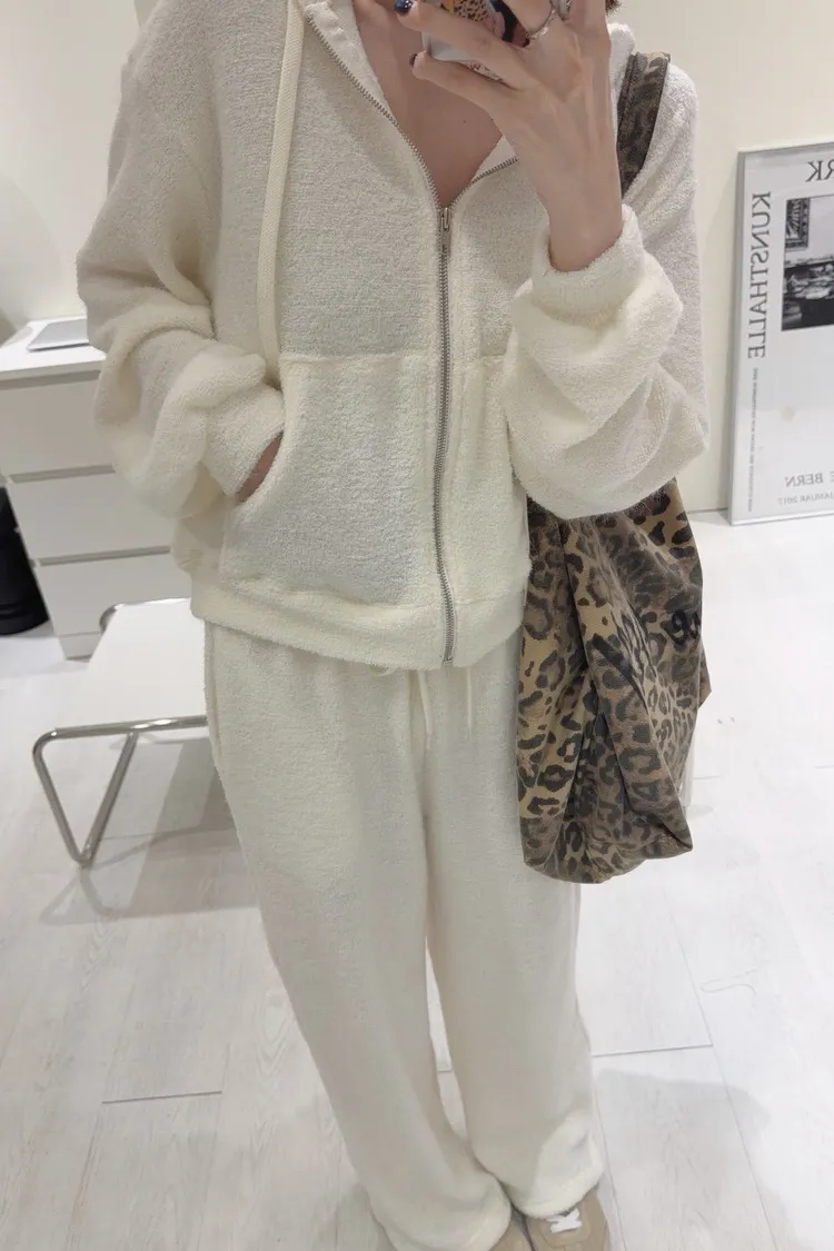 韓-柔絨感連帽外套長褲套裝(米白/黑)