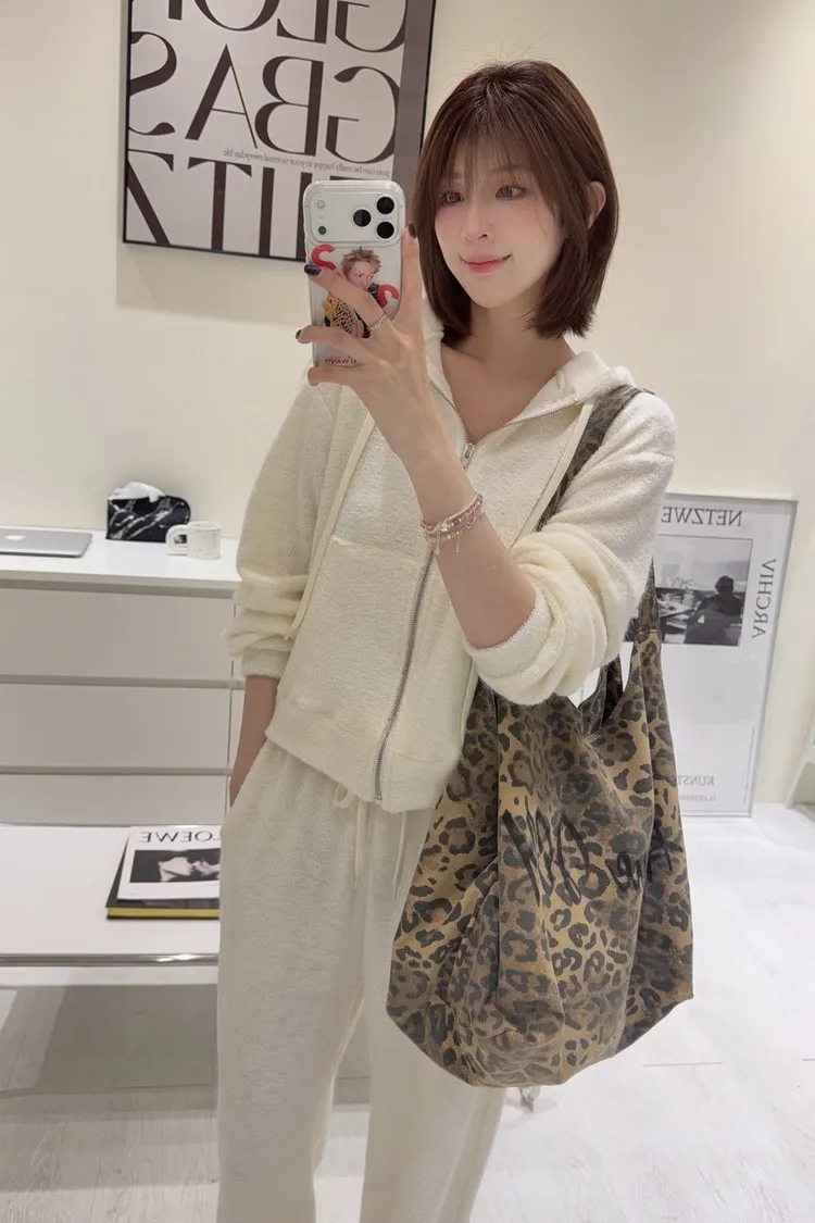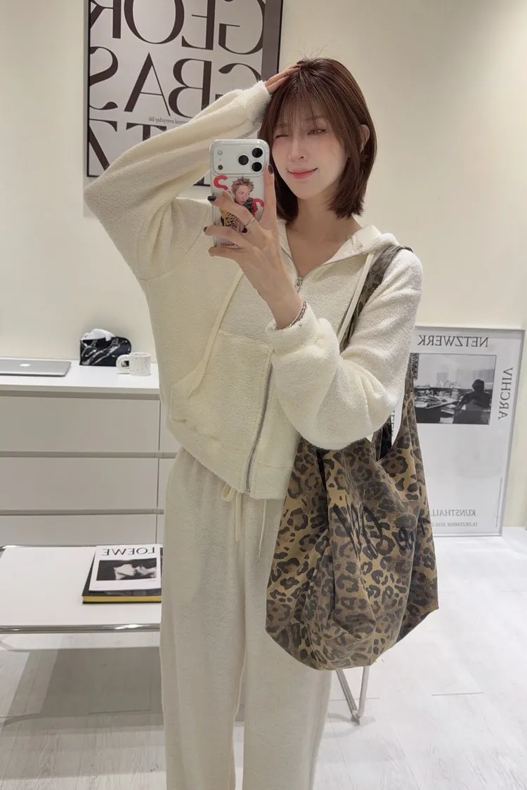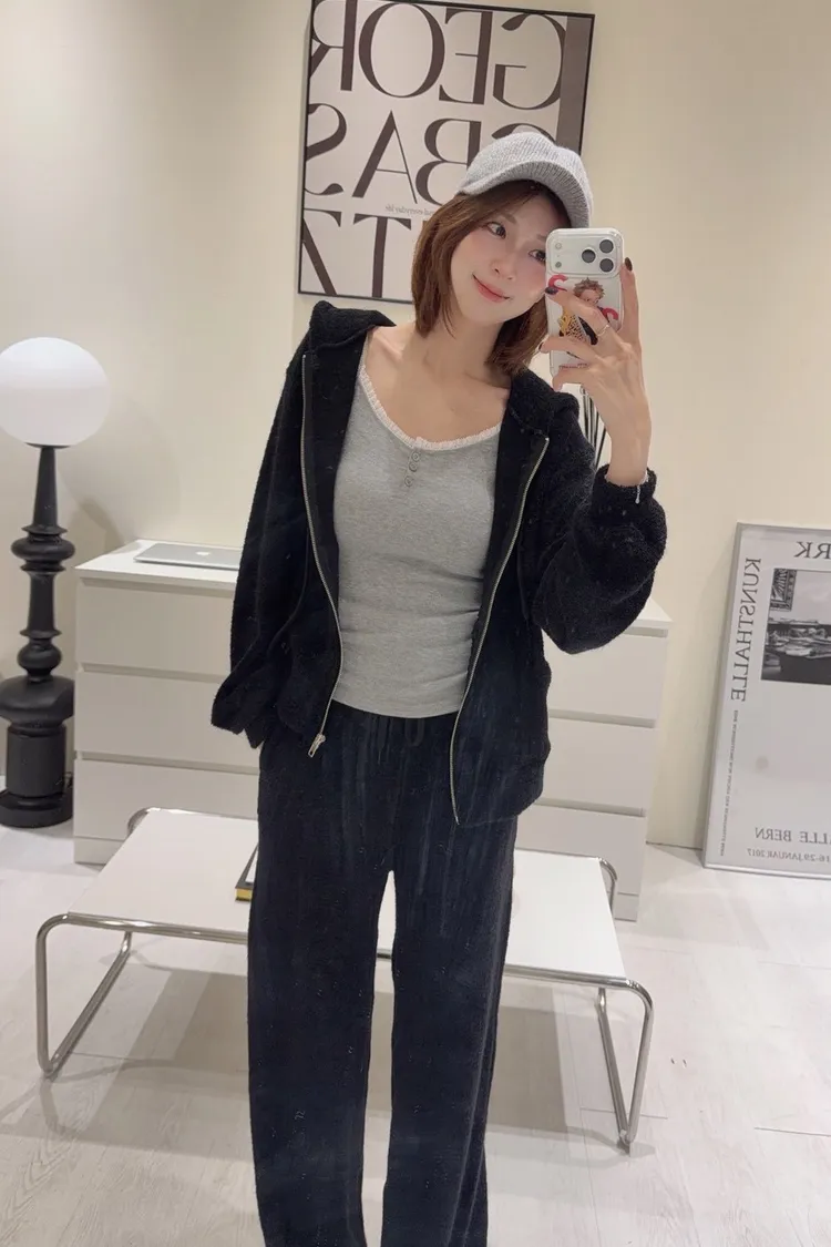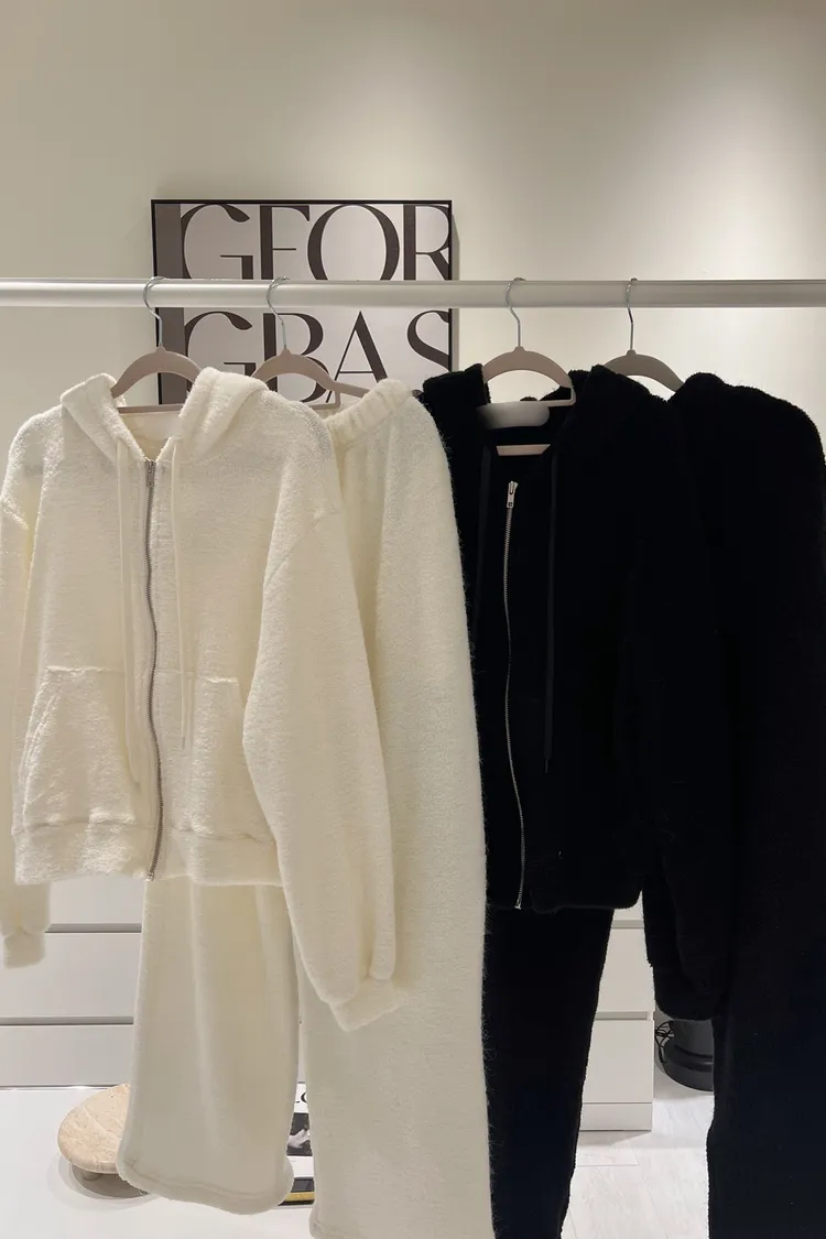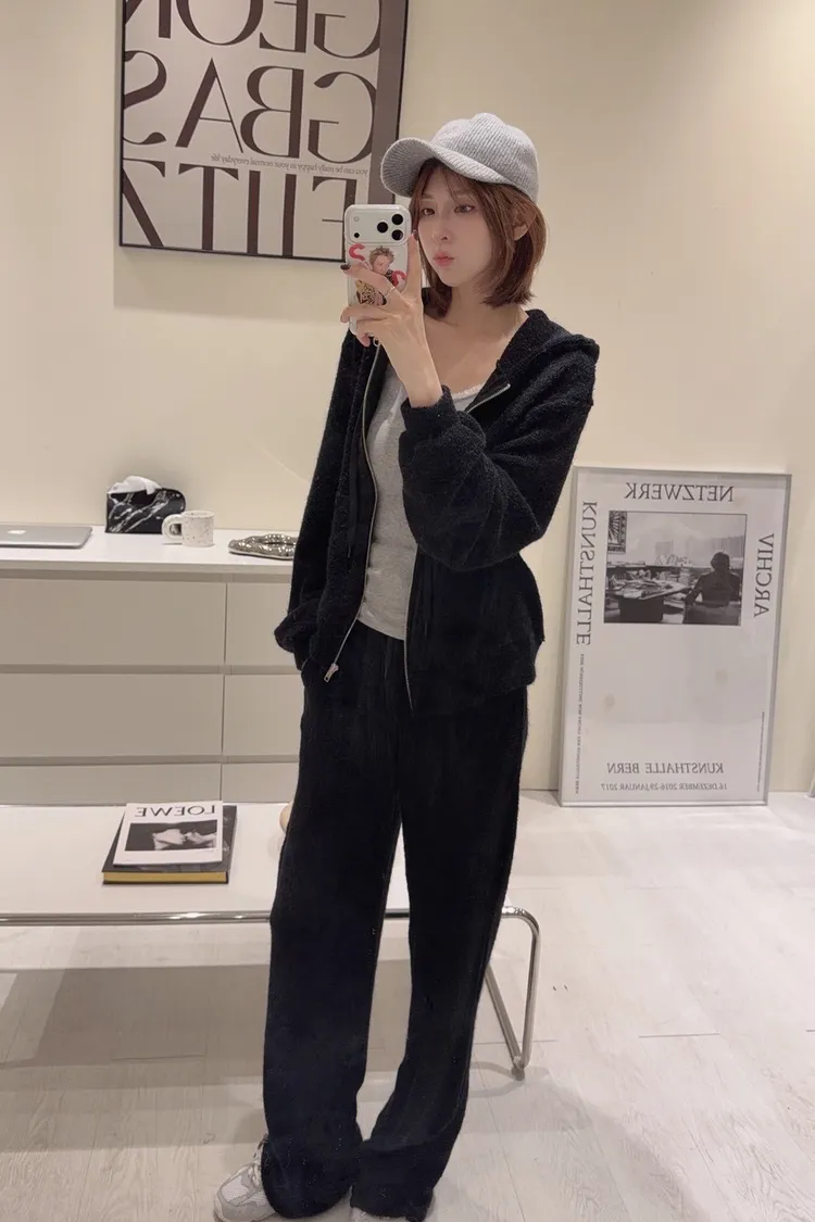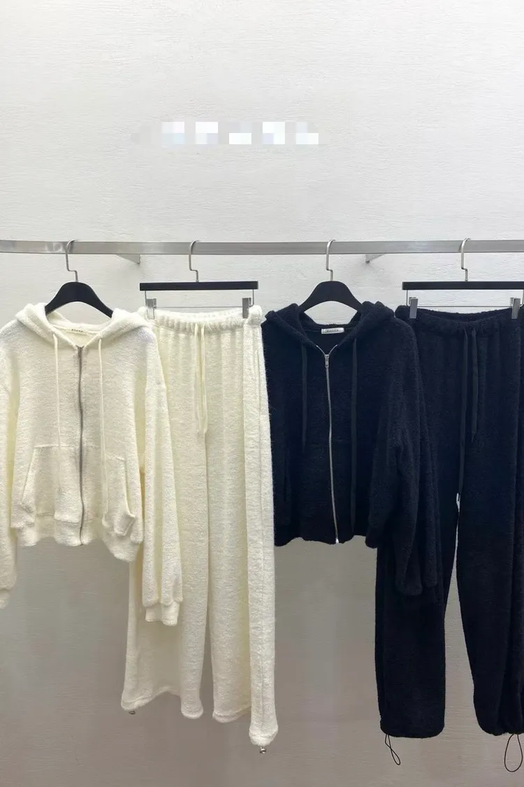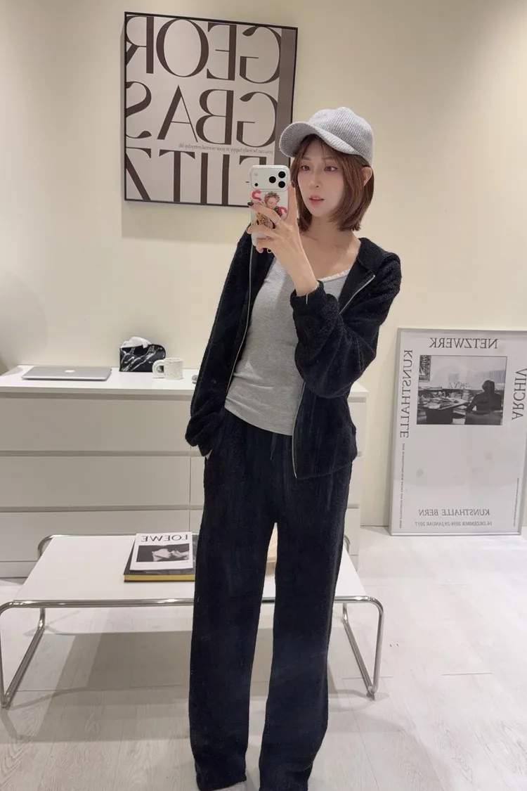 韓-柔絨感連帽外套長褲套裝(米白/黑)