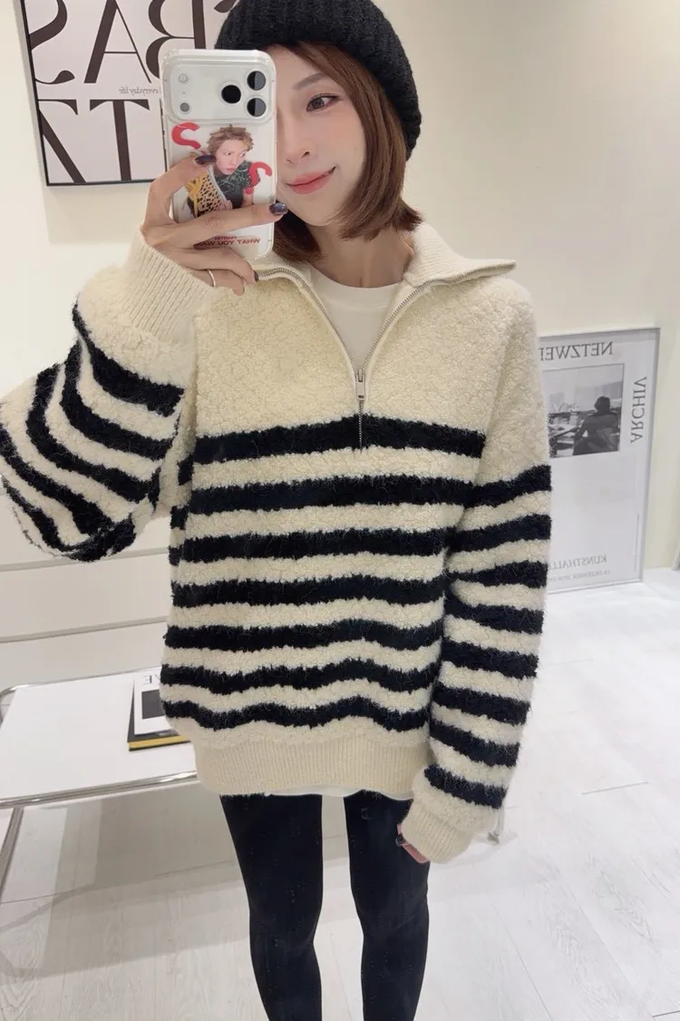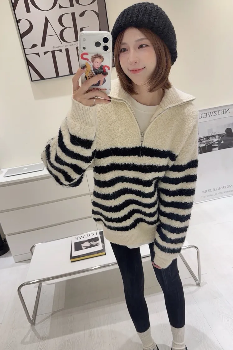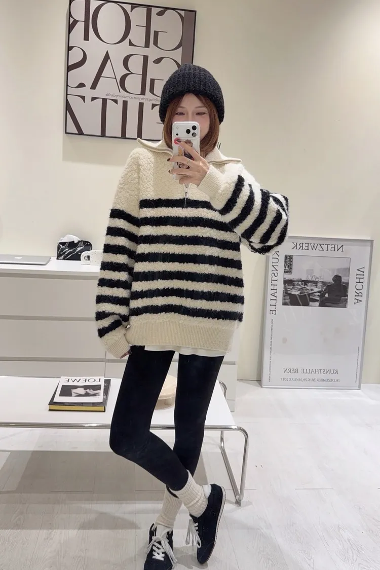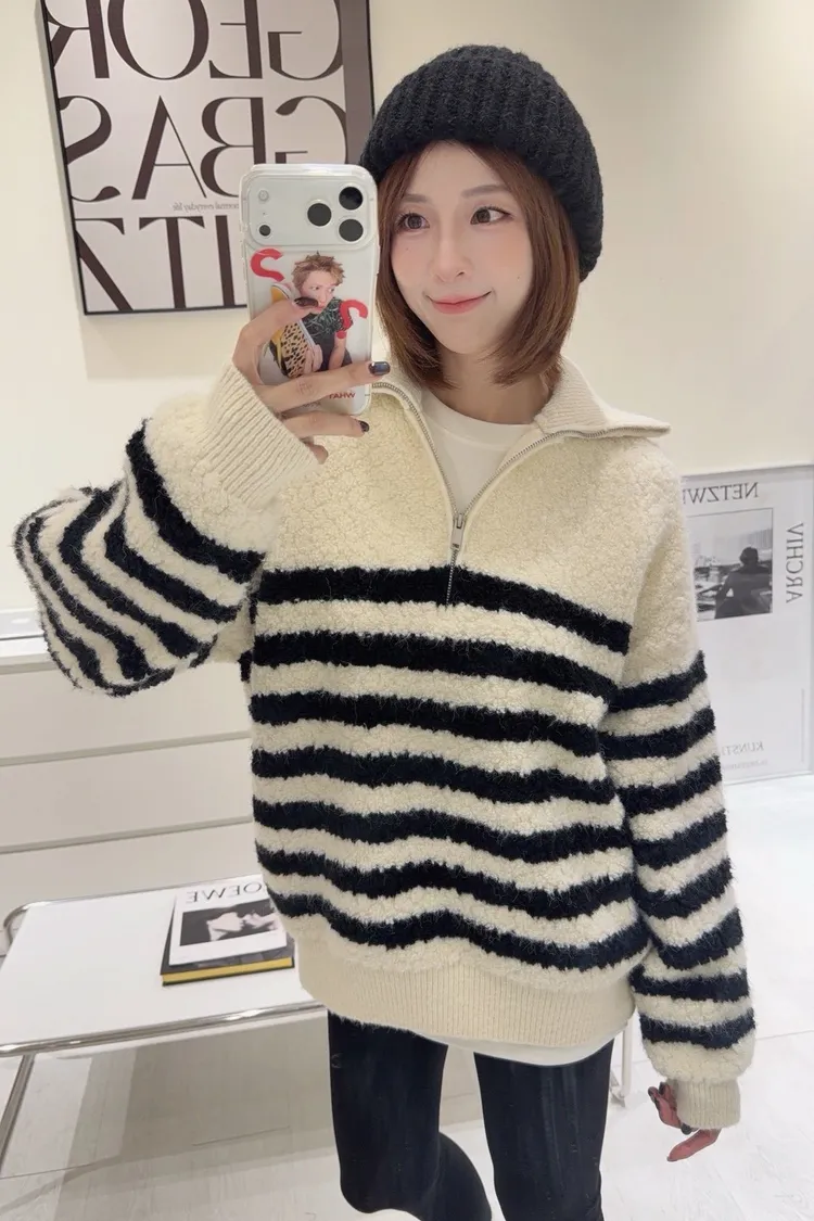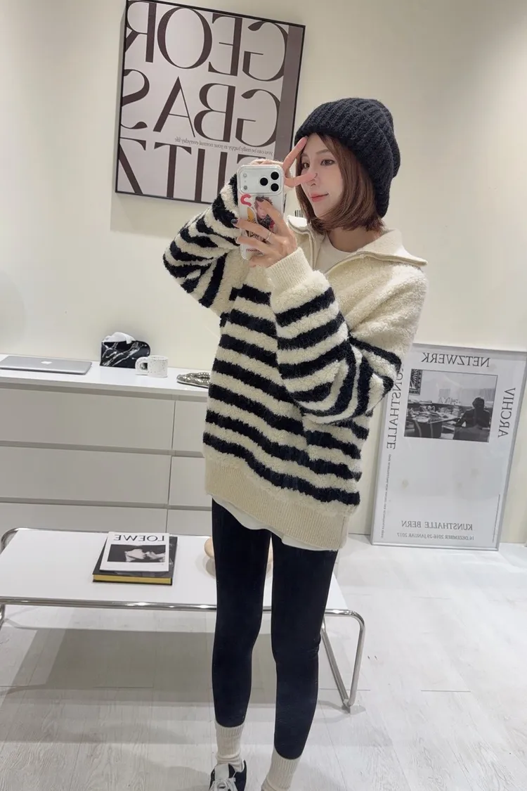 韓-QQ毛翻領半拉鍊條紋毛衣(白)