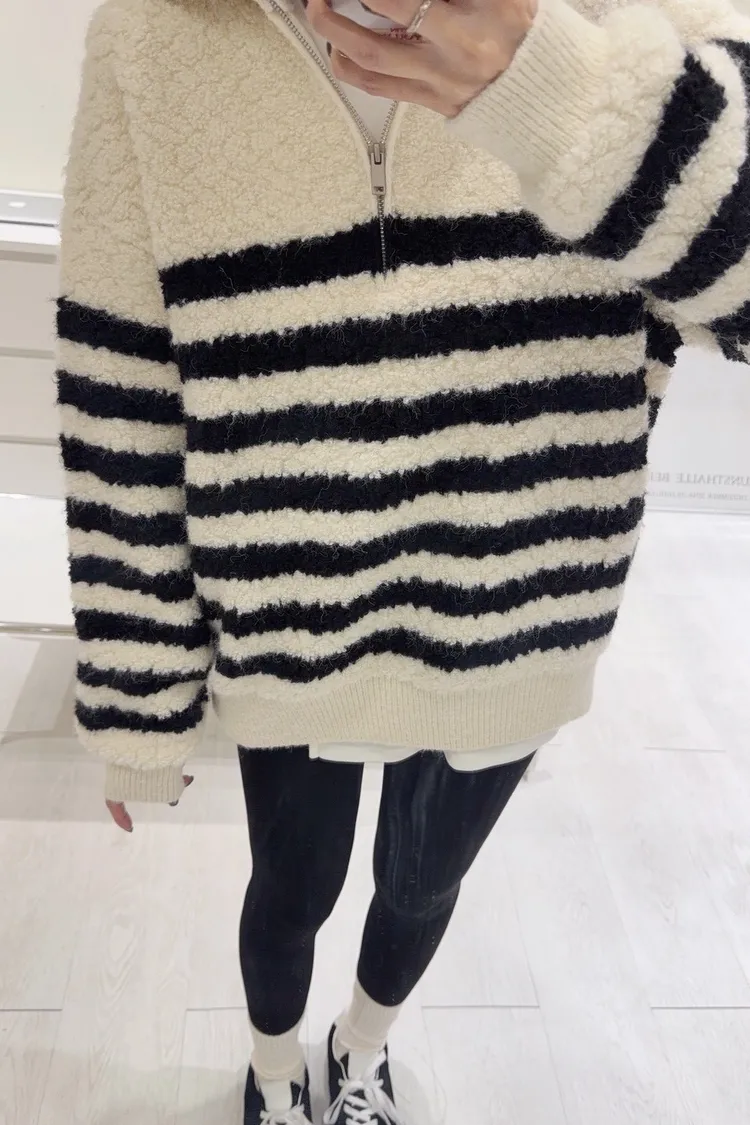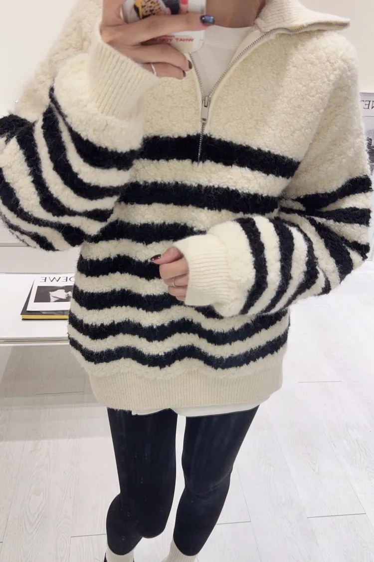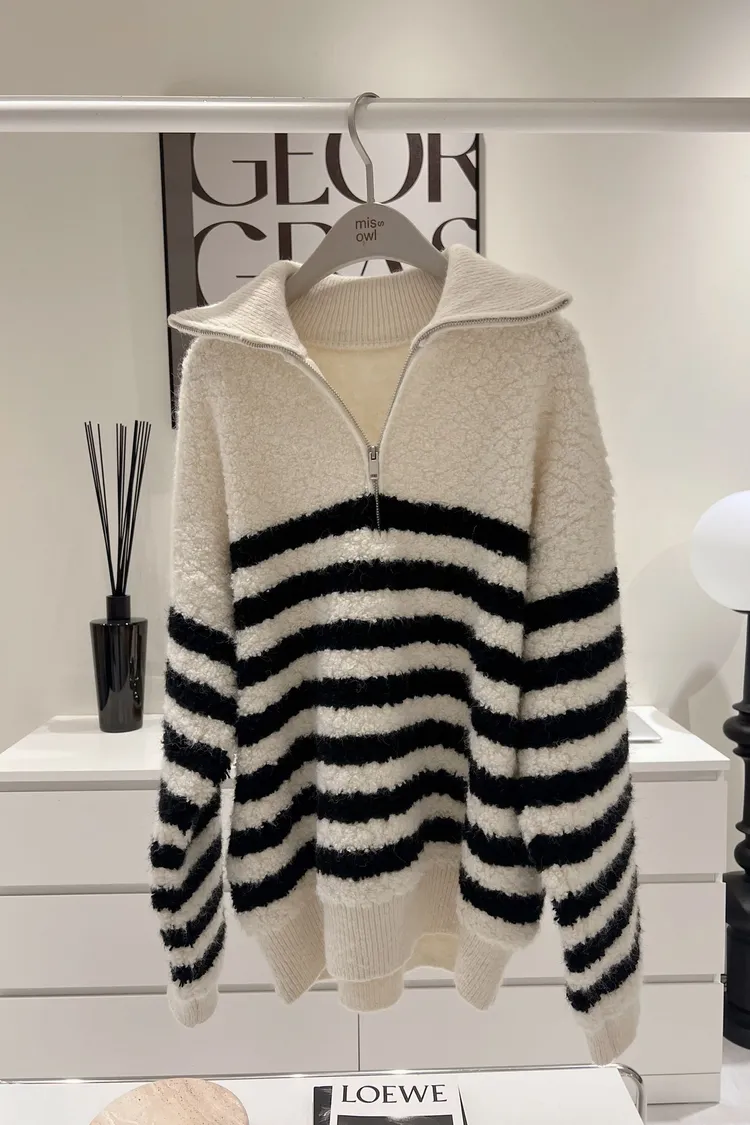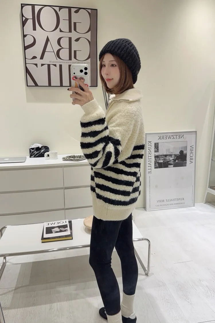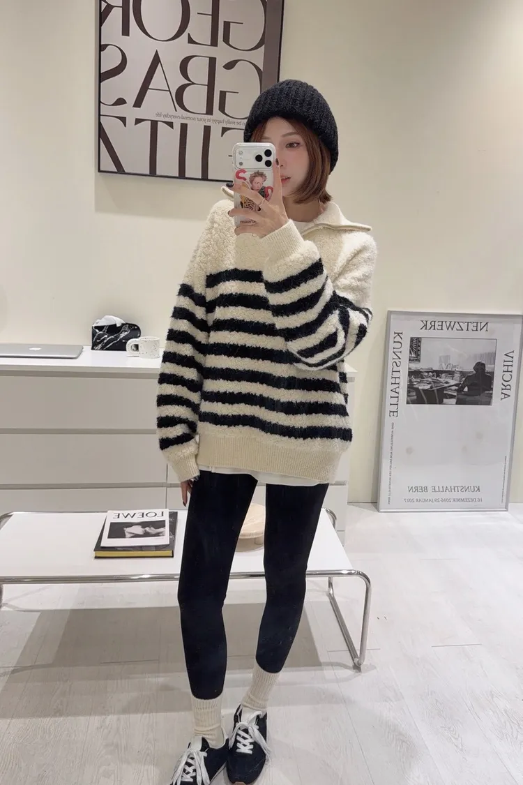 韓-QQ毛翻領半拉鍊條紋毛衣(白)