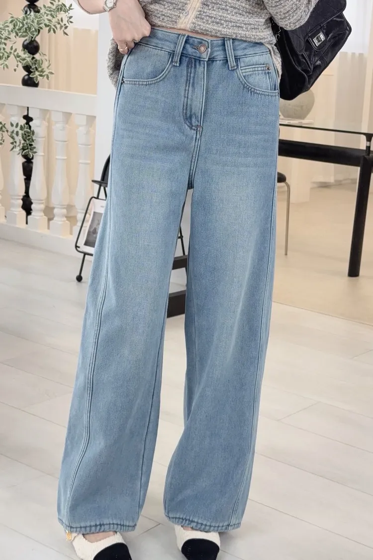 顯瘦刷絨微彎刀剪裁牛仔褲(淺藍)S-XL