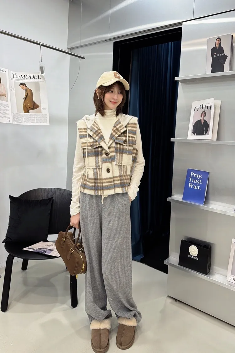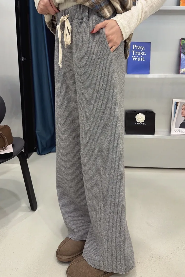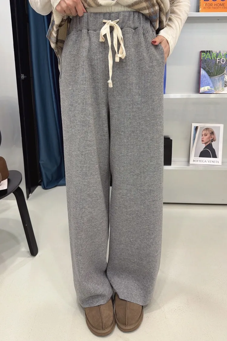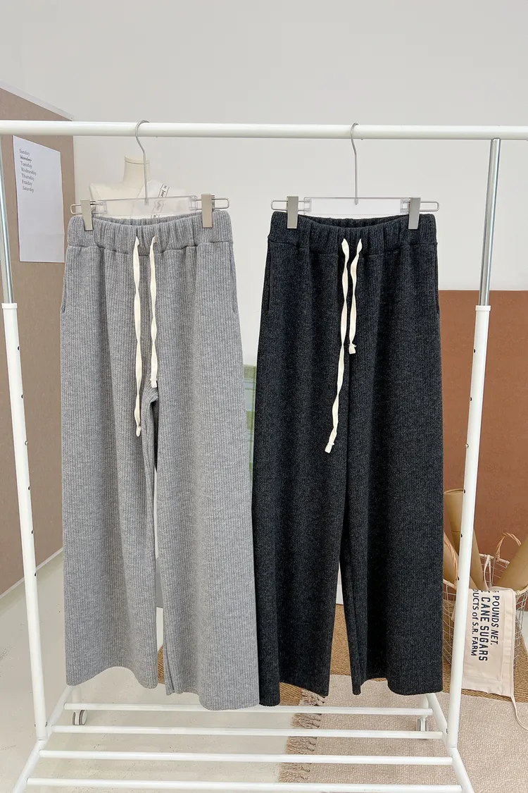 韓-坑紋針織棉綁帶直筒寬褲(淺灰/深灰)