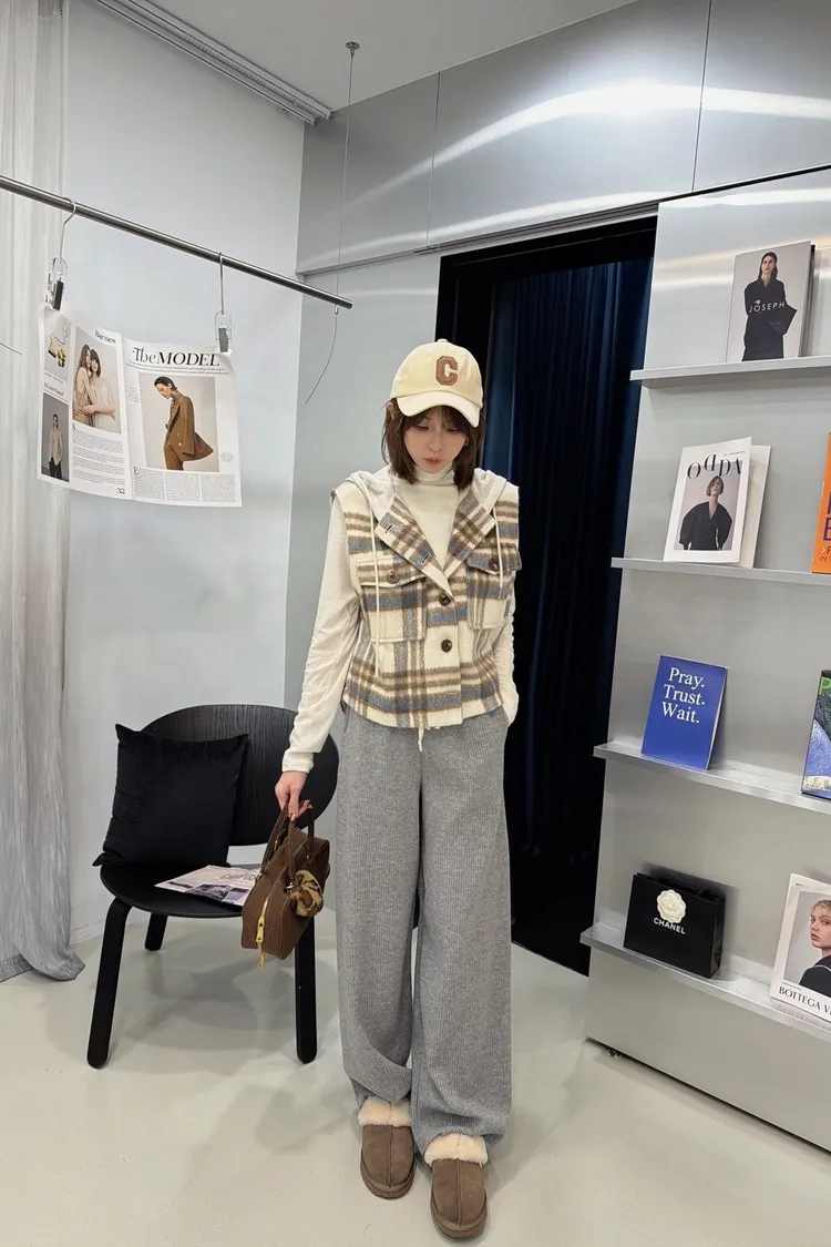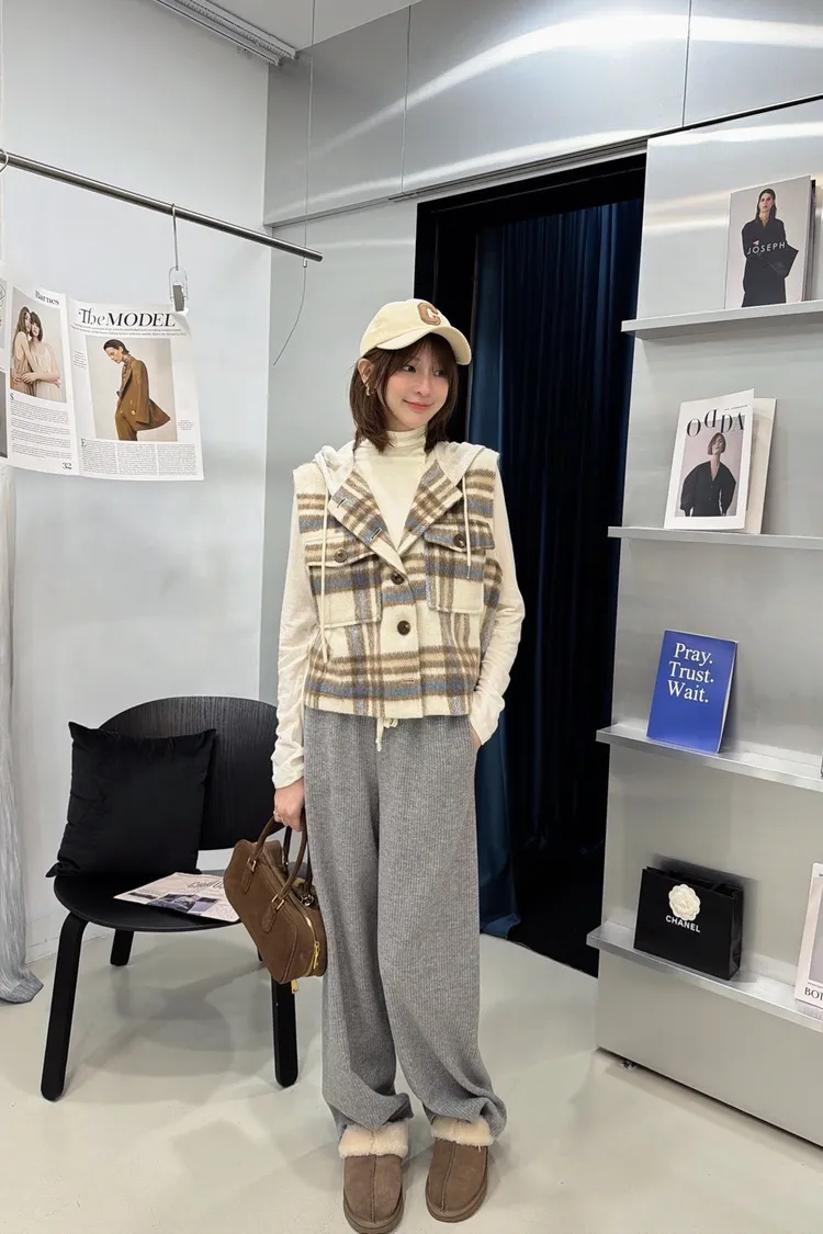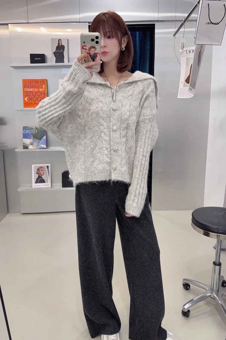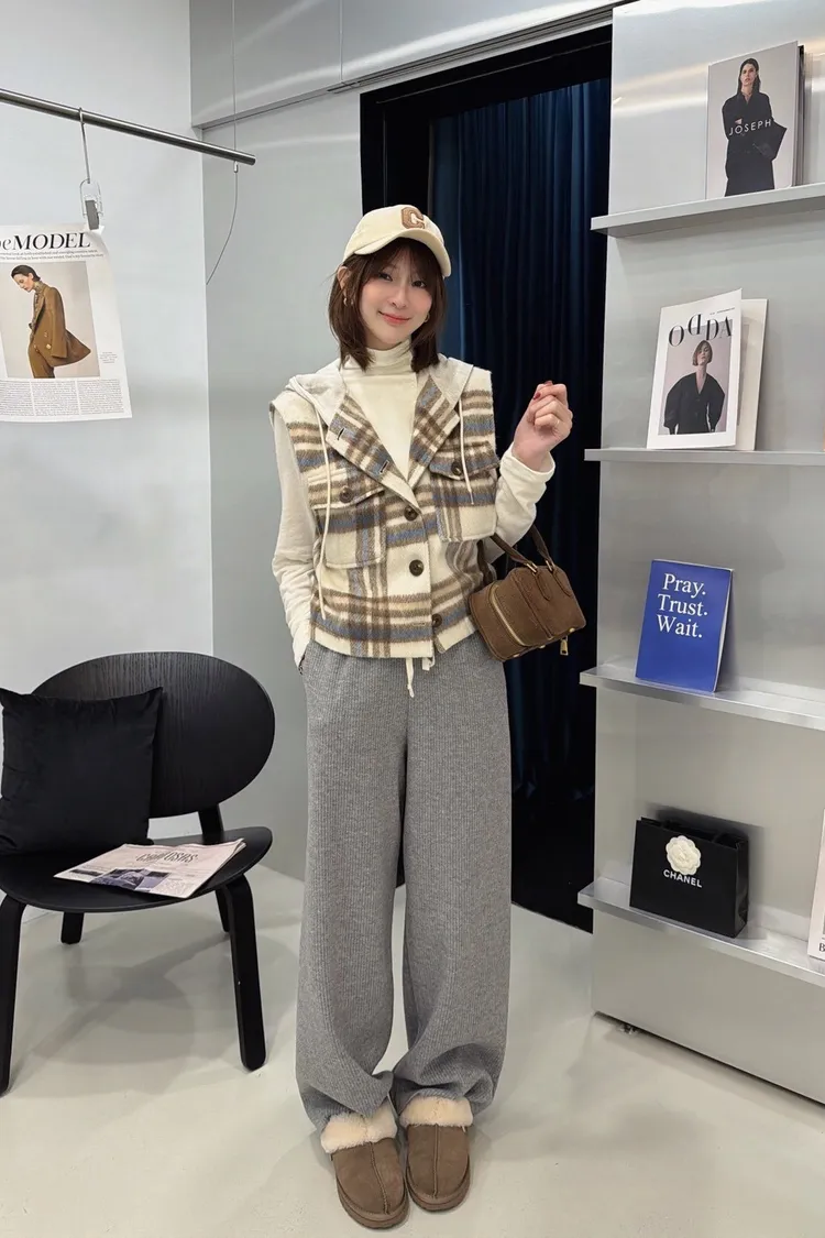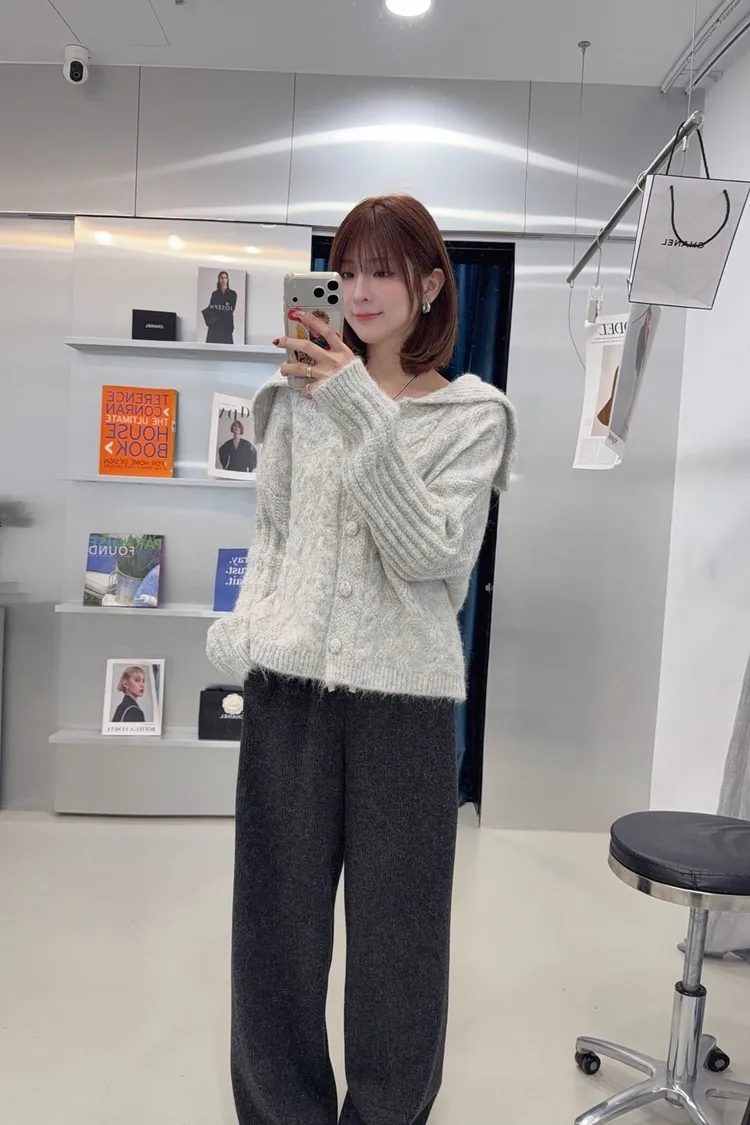 韓-坑紋針織棉綁帶直筒寬褲(淺灰/深灰)