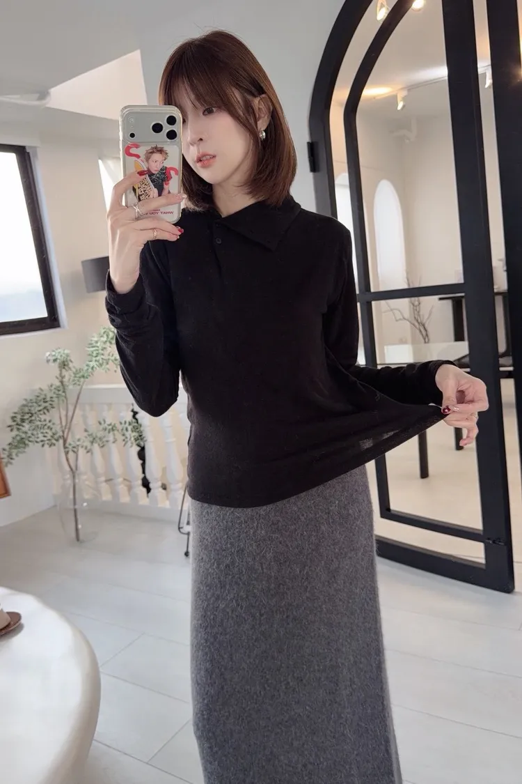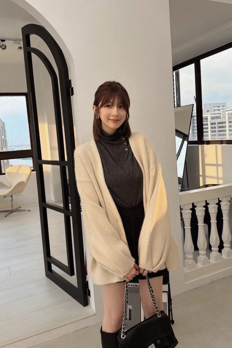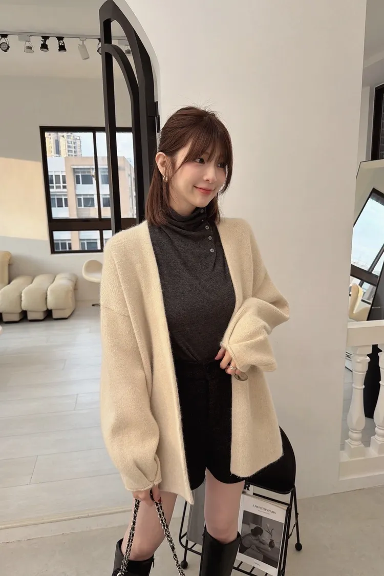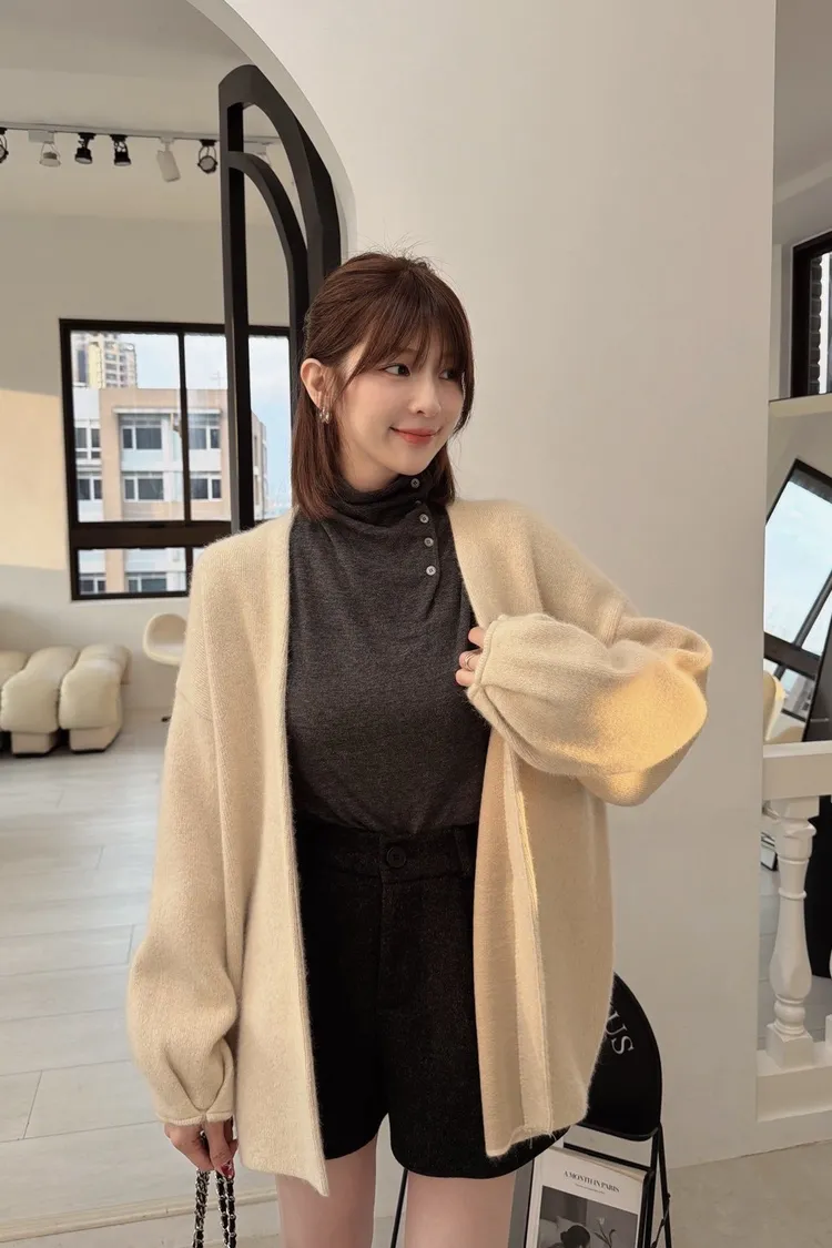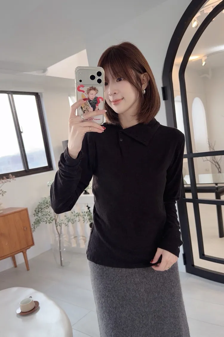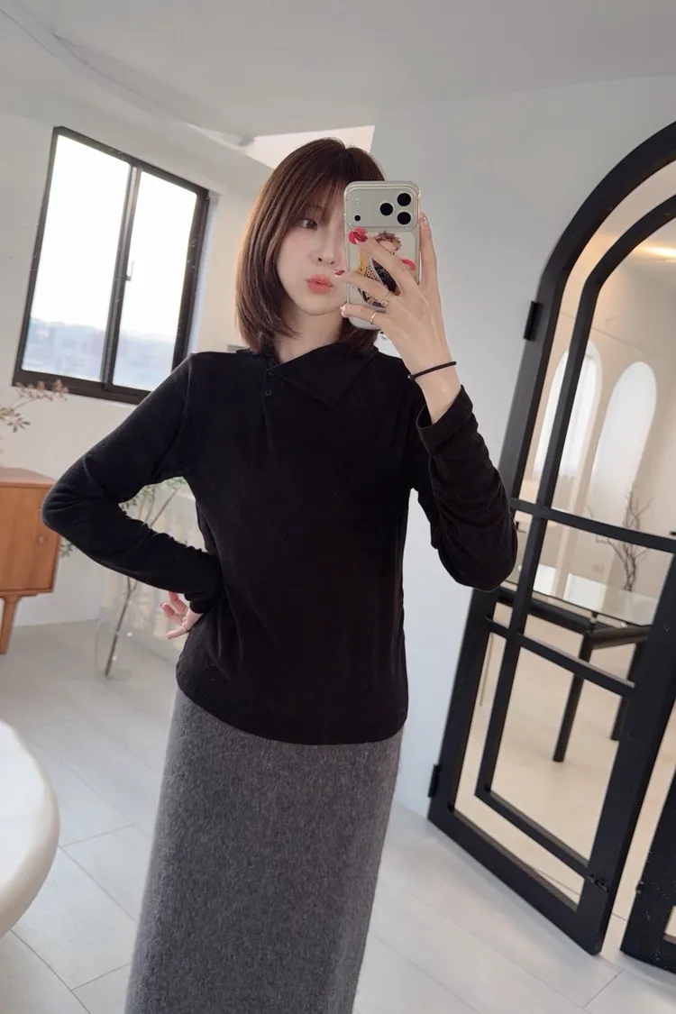 韓-領口鈕扣高領內搭上衣(米白/深灰/黑)