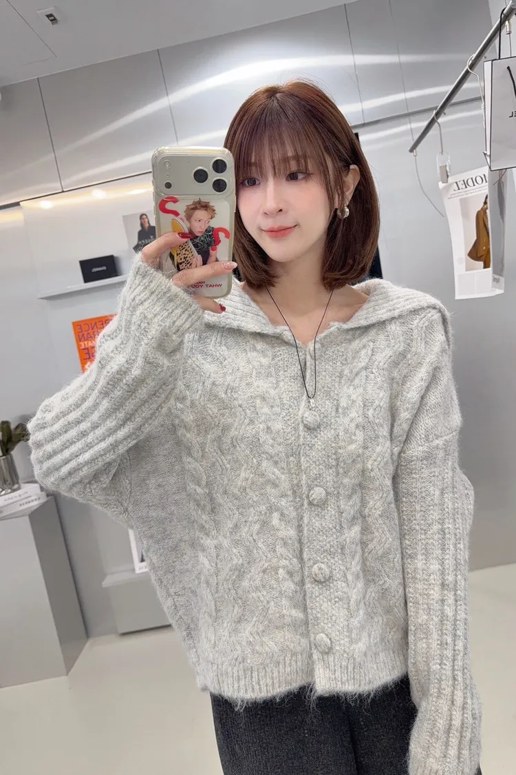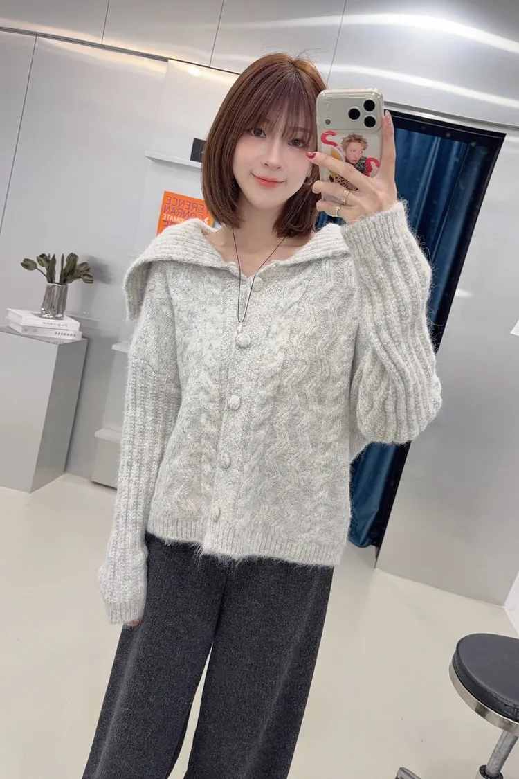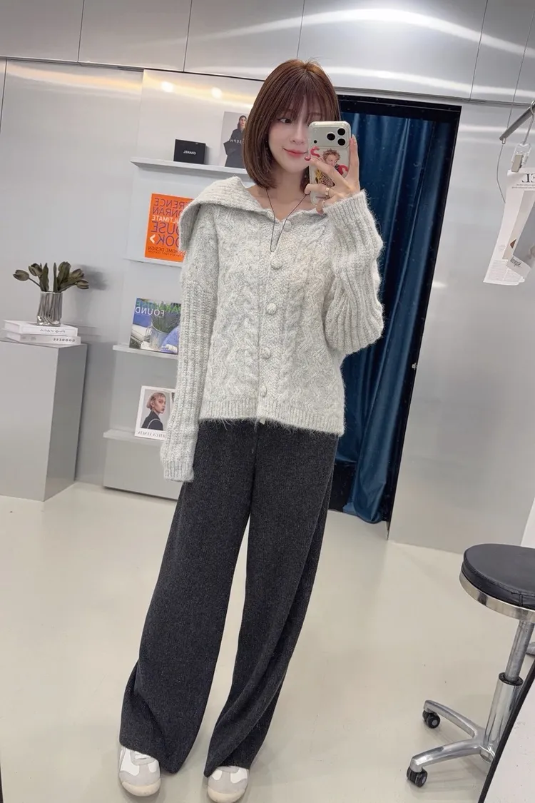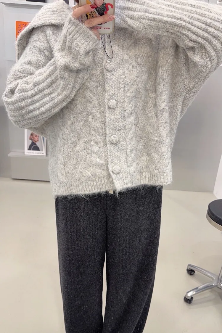 韓-翻領兩穿麻花針織開襟毛衣(灰)