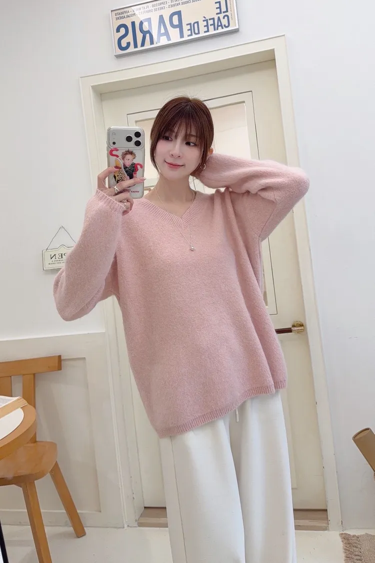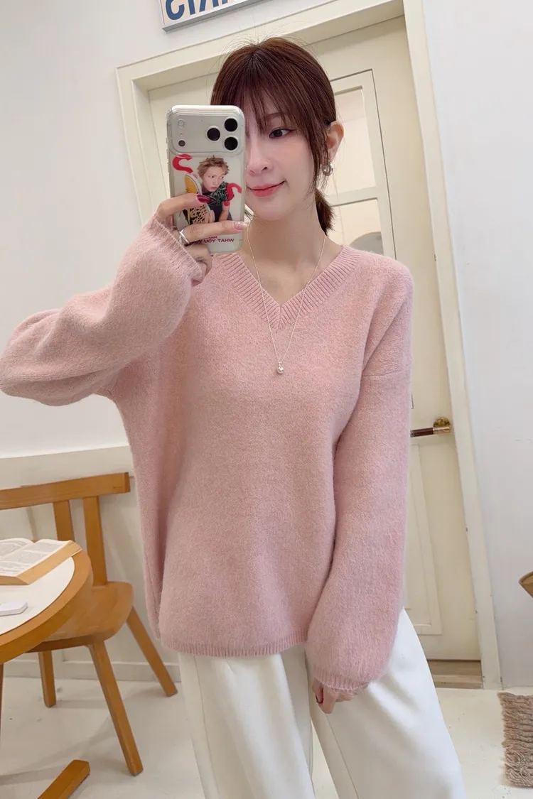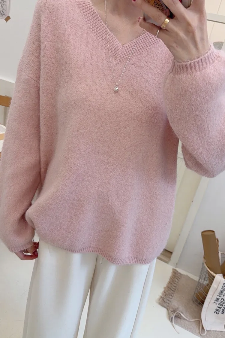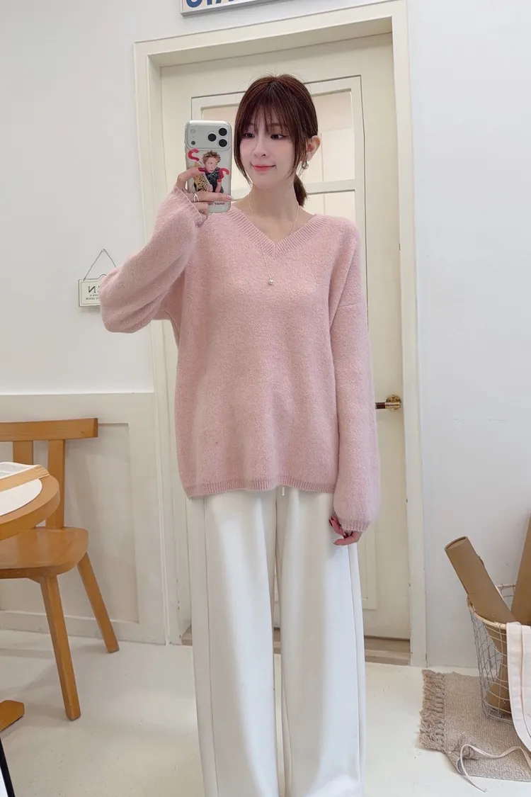 仿浣熊兔毛V領柔軟針織上衣(粉)