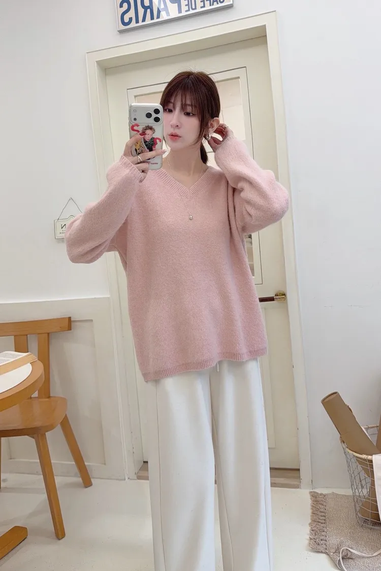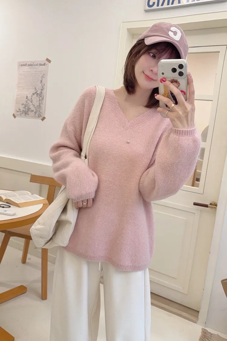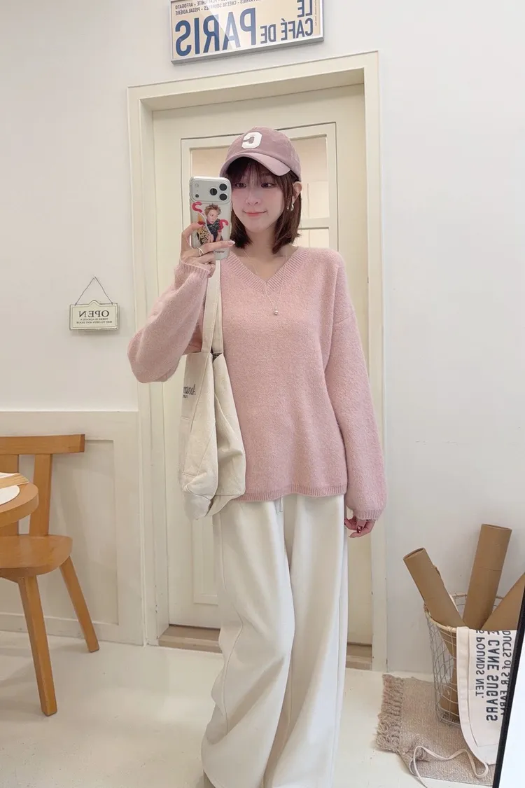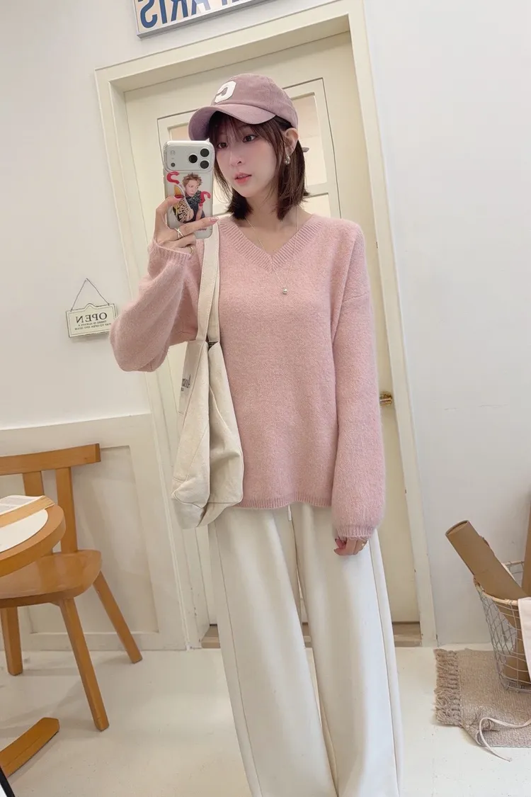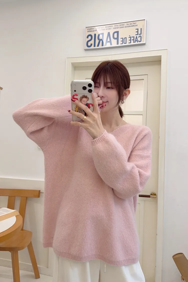 仿浣熊兔毛V領柔軟針織上衣(粉)