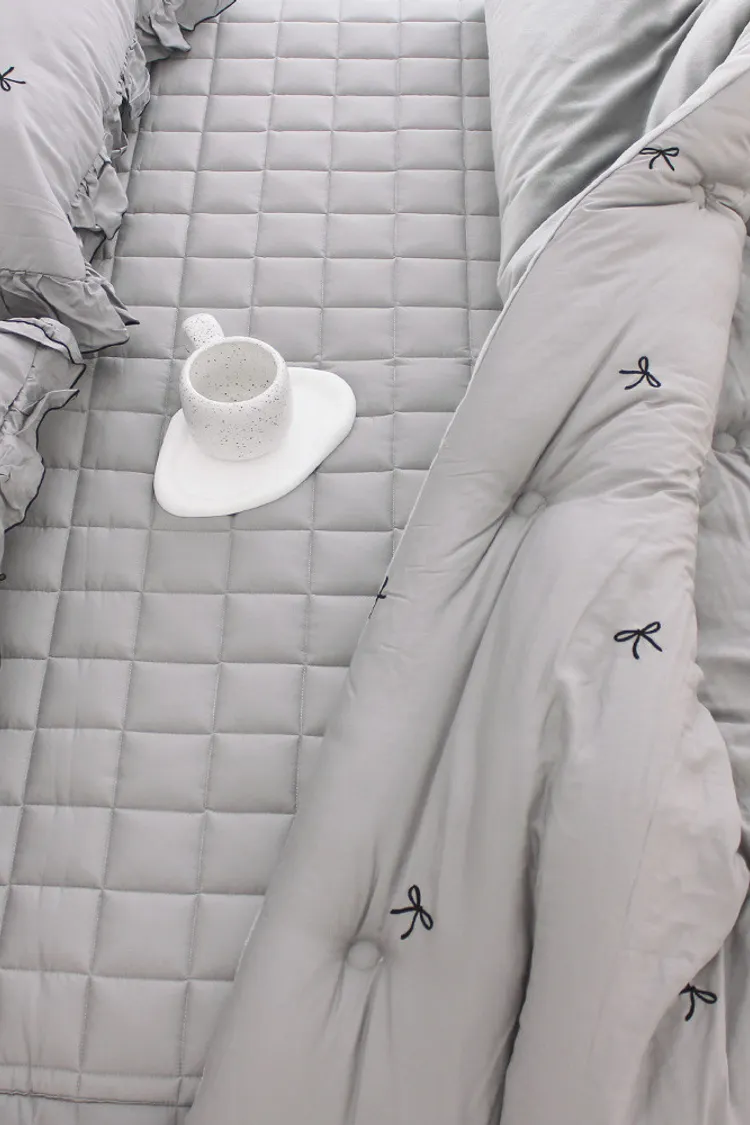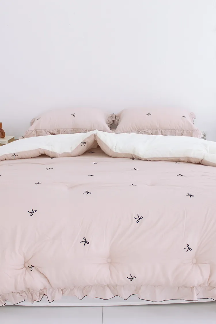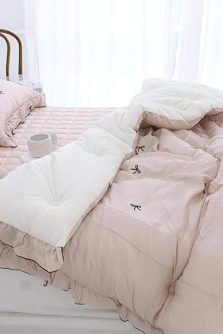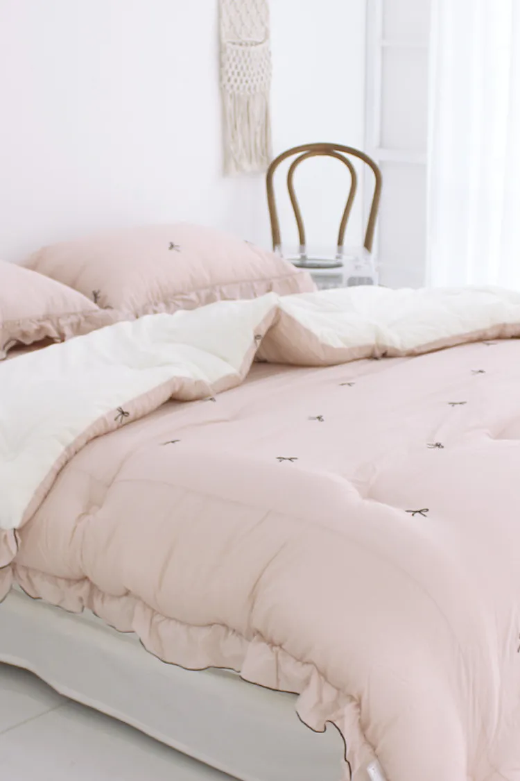 MissOwl自訂款-法式蝴蝶結莫代爾毛絨雙面冬被(粉/灰)